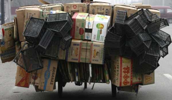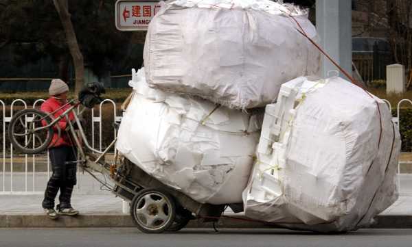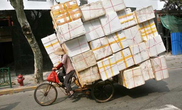А таке можна зустріти на вулицях Шанхаю. Жінка перекладає на велосипеді теплоізоляційні плити. (Фото Nir Elias | Reuters):