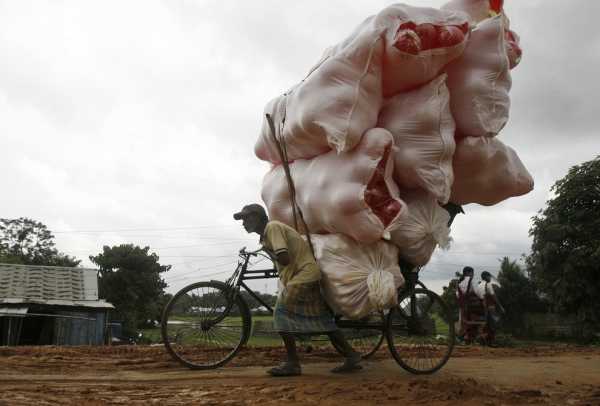 Індійський штат Тріпур. Перевезення пластикових ємностей у мішках. (Фото Jayanta Dey | Reuters):