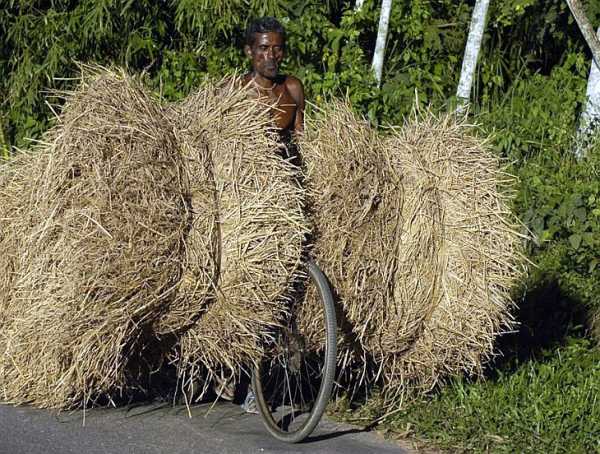 Індійський штат Тріпур. Фермер перевозить солому своїм велосипедом. За один раз більше забрати не вдалось. (Фото Jayanta Dey | Reuters):