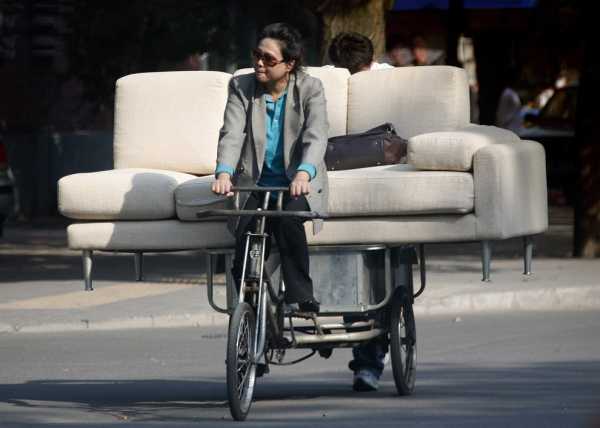 Ця жінка купила диван та везе його додому на своєму триколісному велосипеді. Мабуть, доставка не входила до вартості. Центр Пекіна. (Фото David Gray | Reuters):