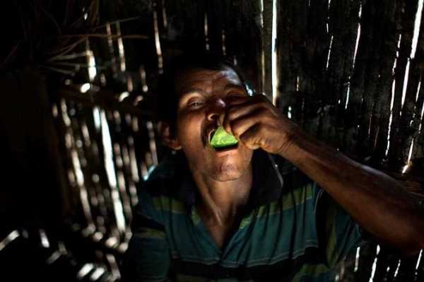 Чоловік, що ковтає мамбе (mambe) – суміш, виготовлену з подрібненого листя коки.