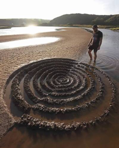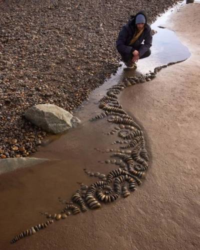За допомогою цих простих матеріалів він створює дивовижні композиції: спіралі, хвилі, геометричні візерунки, які здаються невід'ємною частиною пейзажу.