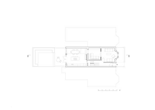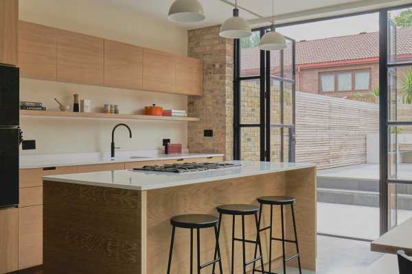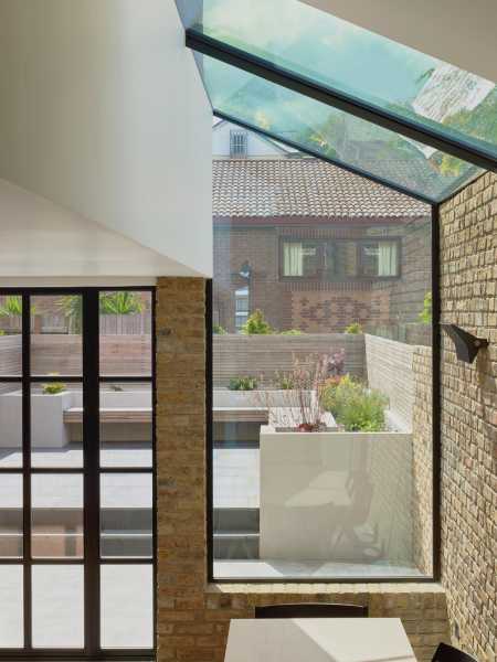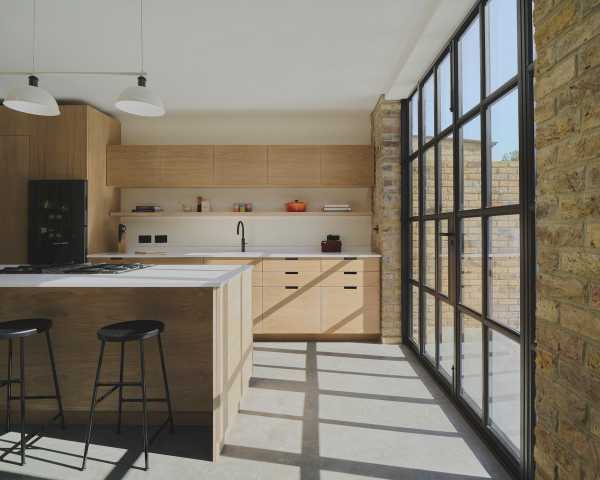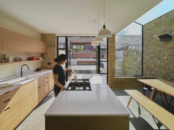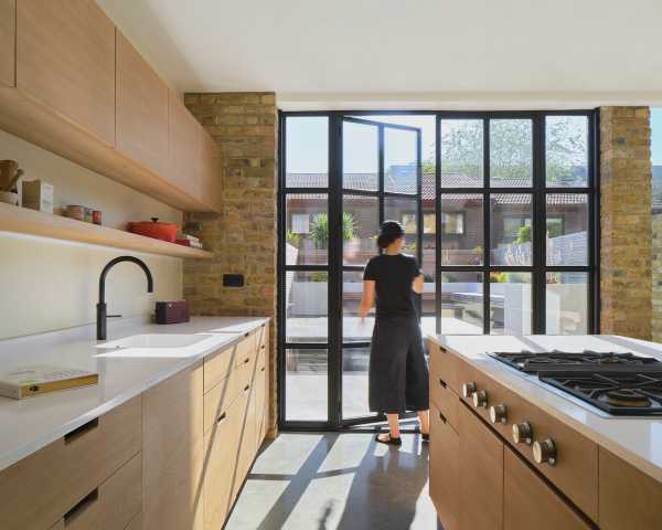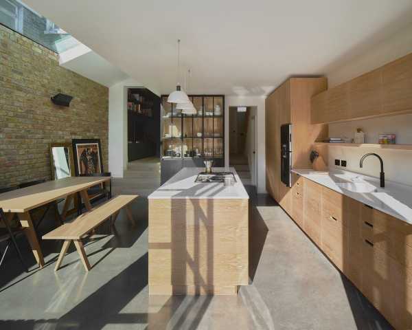 Проект з'єднує кухню, що раніше була невеликим окремим камбузом у задній частині будинку, з рештою будинку, щоб позначити новий простір для розваг та спілкування. Студія RISE Design провела розкопки майже на метр вниз, щоб створити великий об'єм у новій кухні і підкреслити природне світло від панорамного скління. Оригінальні цегляні стіни були збережені та відреставровані, доповнюючи індустріальну палітру у бруклінському стилі зі сталі, порцеляни, бетону та дерева. Термічно розбиті сталеві та скляні двері ведуть у ландшафтний сад, також спроектований RISE.