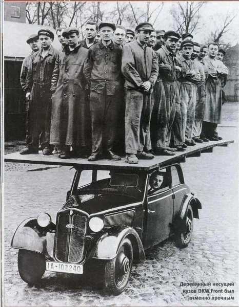 28 людей стоять на автомобілі марки DKW F8, щоб перевірити міцність дерев'яного кузова, 1932 рік