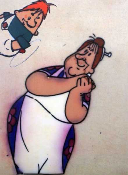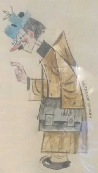 Із Шапокляк теж усе вийшло просто. Шапокляк – це, як відомо, назва складаного циліндра. Це XIX століття, і звідси пішла решта: чорна сувора сукня, жабо, білі мереживні манжети, туфельки-човники на каблучках. Оскільки вона — шкодлива така бабця, Шварцман зробив їй довгий ніс, рожеві щічки та видатне підборіддя. А сиве волосся і пучок запозичив у своєї тещі