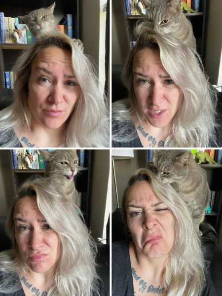 «Ця кішка періодично заходить до мене через веранду, їсть корм моєї кішки, спить на моєму улюбленому кріслі, і йде. На цьому фото вона жере моє волосся, поки я намагаюся спокійно попити ранкову каву. Це не моя кішка!