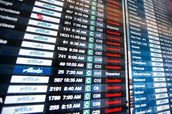 Список скасованих рейсів на інформаційному табло в Терміналі З Міжнародного аеропорту Логан під час снігового шторму «Стелла» у Бостоні, штат Массачусетс, 14 березня 2017 року.