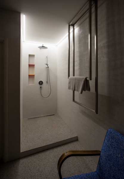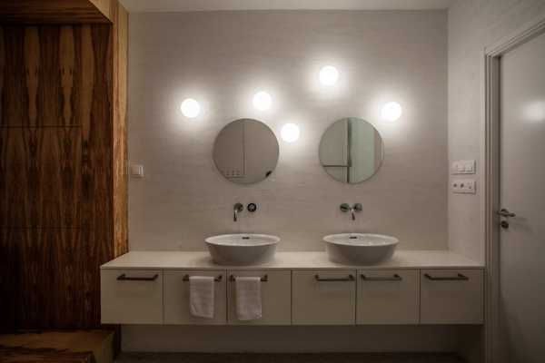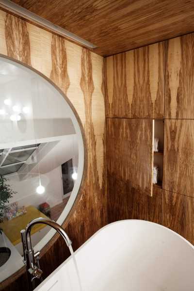 Білі стіни наповнюють простір свіжістю та чистотою, а також є чудовим тлом для багатої картинної галереї власників будинку. Родзинкою оформлення стали оригінальні художні вкраплення у вигляді легкої мозаїки над ліжком, круглого вирізу у стіні між ванною кімнатою та вітальнею, великоформатної картини улюбленого художника, надрукованої на склі над кухонним столом.