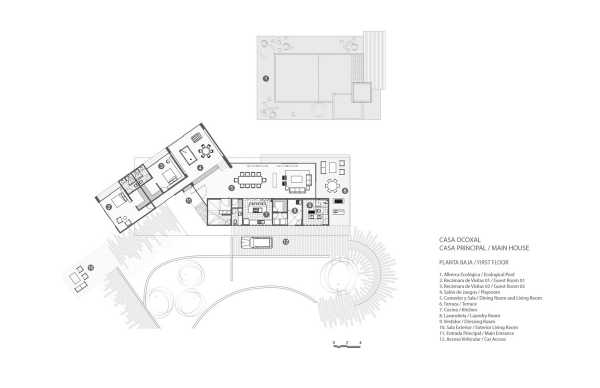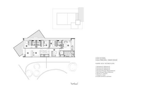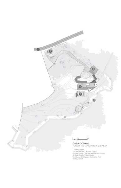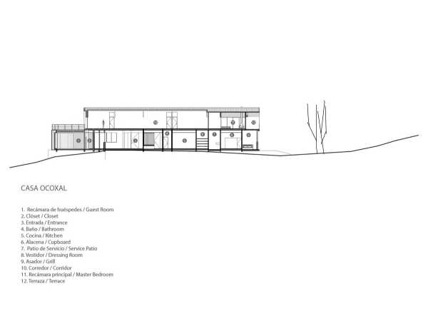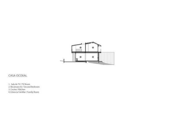Ocoxal House розташований у лісі, що межує з Валле-де-Браво, за 160 км від Мехіко, на ділянці землі площею 9000 м2, що функціонує як продуктивна мікросистема, в яку будинок інтегрований з повагою. Форма головного будинку народжується з геометрії накладених один на одного об'ємів, через які мешкає порожнеча. Формальна композиція нагадує традиційні будинки у Вальє-де-Браво, зображення хатини з гострим дахом пропонує нову інтерпретацію цієї іконографії із сучасною естетикою, досягнутою завдяки чорному листу на фасаді, бетону та склу.
