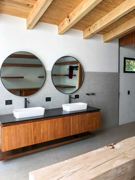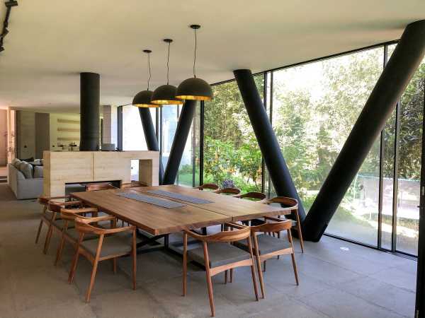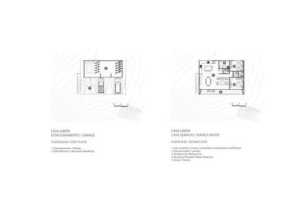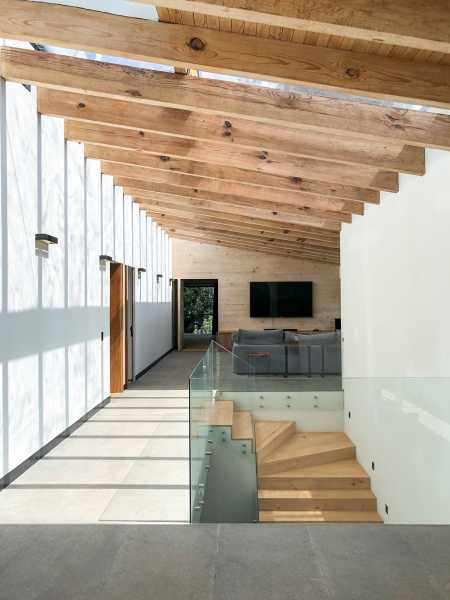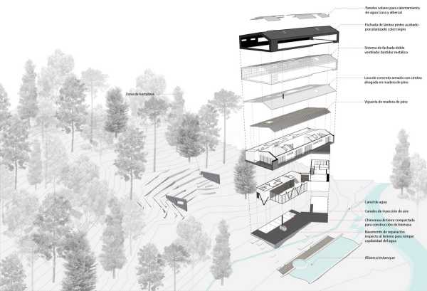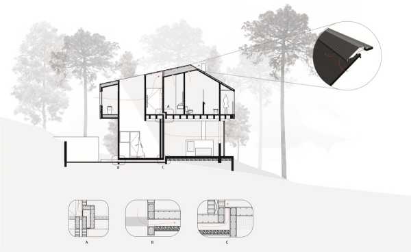 Верхній об'єм містить приватні житлові приміщення сім'ї, а нижній гостьові спальні. У порожнечі, утвореній перетином цих обсягів, є спільні простори, які дозволяють встановити зв'язок між інтер'єром та екстер'єром, сприяючи спогляданню дикої природи та розумінню екосистеми. Проект являє собою не тільки будинок для сімейного відпочинку, а й вичерпну творчу вправу, спрямовану на задоволення всіх функціональних вимог та надання цінності цілому, починаючи зі спостереження та розуміння ролі кожного елемента, що є присутнім у просторі цього втручання.