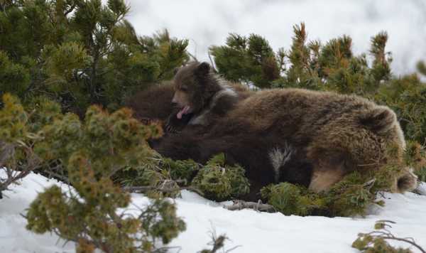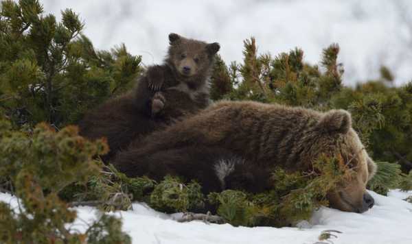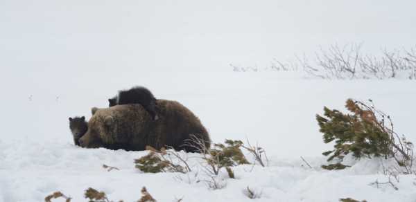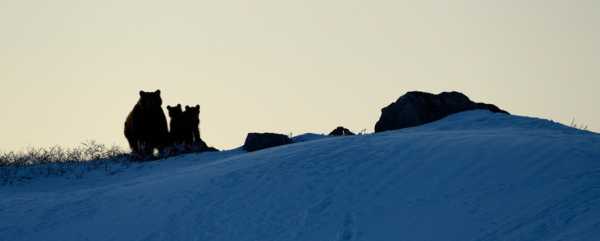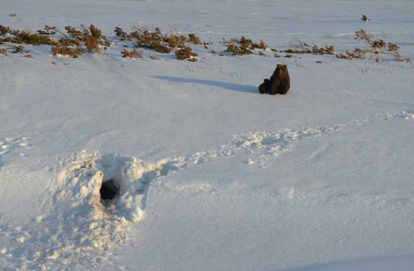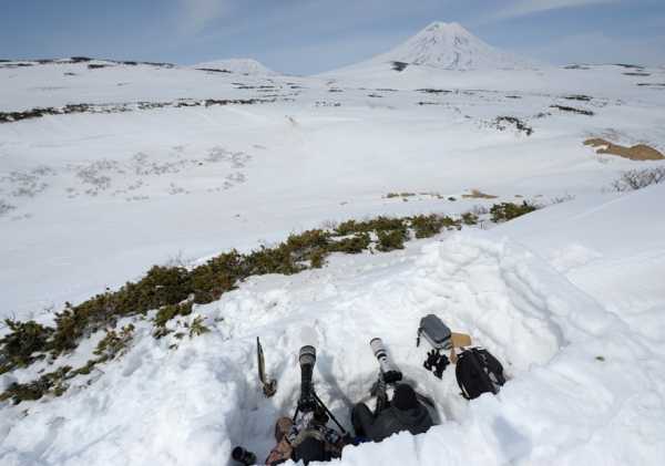 Знімають фільм про ведмеже дитинство. І дещо вже вдалося за єдиний погожий день. За весну я знайшов більше десятка барлог, але тільки дві з них за місцем свого розташування придатні для спостереження з невеликої дистанції та зйомки. З однієї ведмежа родина вийшла два дні тому і поки що тримається поруч із барлогою. Ведмежата починають пізнавати світ просто неба і їх вдається знімати! З другого барлогу ведмеді ще не вилазили, але чути голоси цьогорічок. На верхньому знімку, зробленому волонтером з Петропавловська-Камчатського В. Русіним, видно нашу засідку за сто метрів від барлоги. Довелося огородитися сніговою цеглою, щоб пориви сильного вітру не трясли відеокамеру.