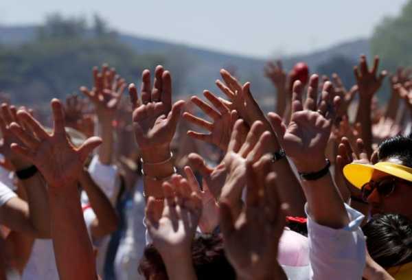 Люди тягнутися руками до Сонця під час святкування дня весняного рівнодення біля Піраміди Сонця у стародавньому місті Теотіуакан у Мексиці, 20 березня 2017 року