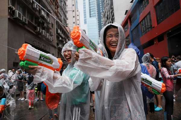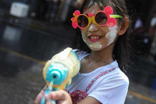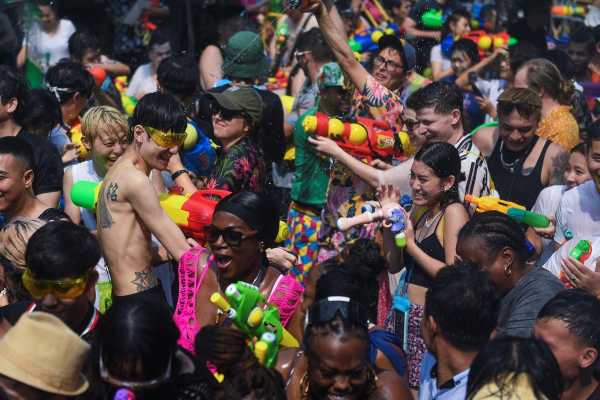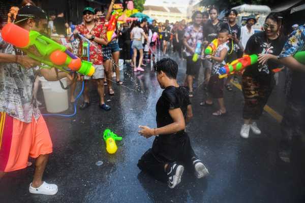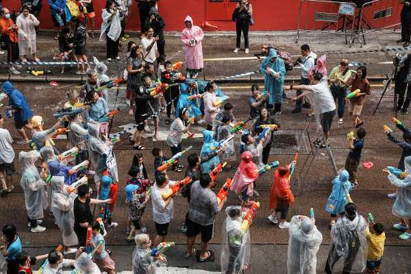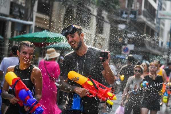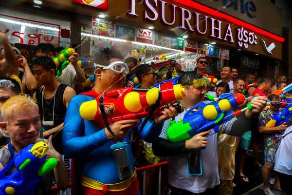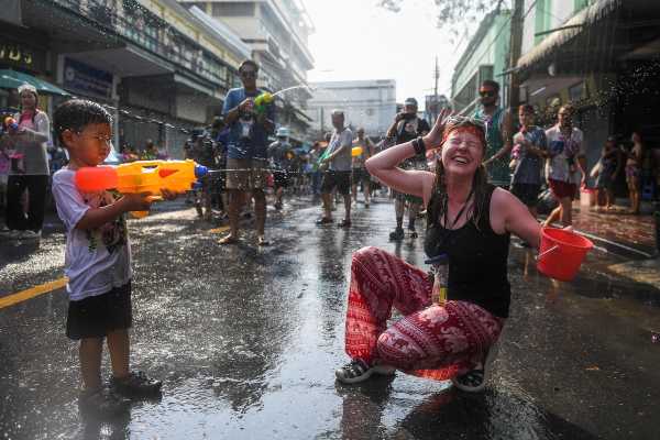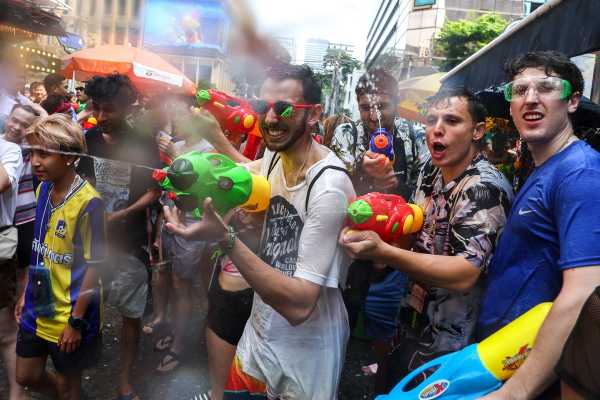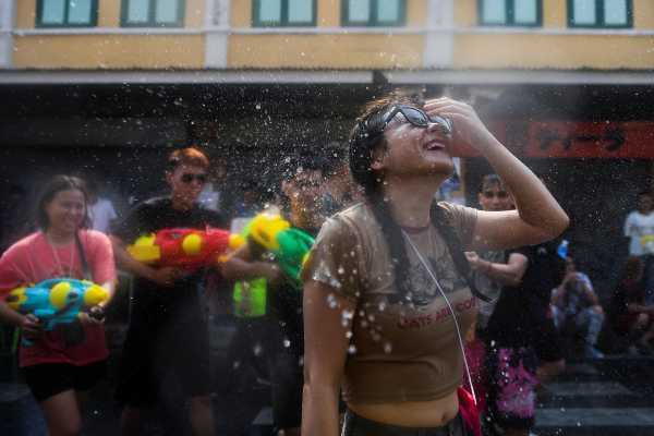 Гуляки — багато з них промокли до нитки — пройшли півкілометровий відрізок туристичним центром Бангкока на Хаосан-роуд, без розбору стріляючи з водяних пістолетів і танцюючи під музику, що долинала з придорожніх закладів.