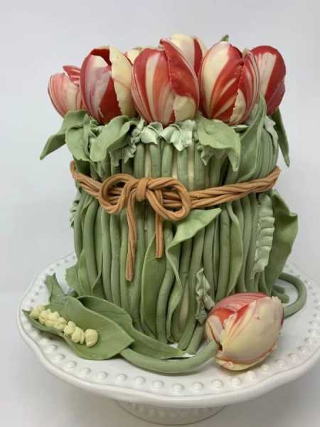 Усередині полуничний торт з вершковим кремом з меренги. Зовні стебла та листя зроблені з домашнього шоколаду для моделювання. Тюльпани пофарбовані та покриті білим шоколадом.