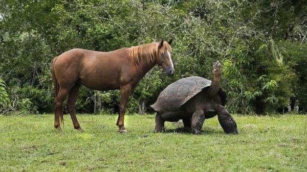 Розмір Галапагоської гігантської черепахи порівняно з розміром коня.