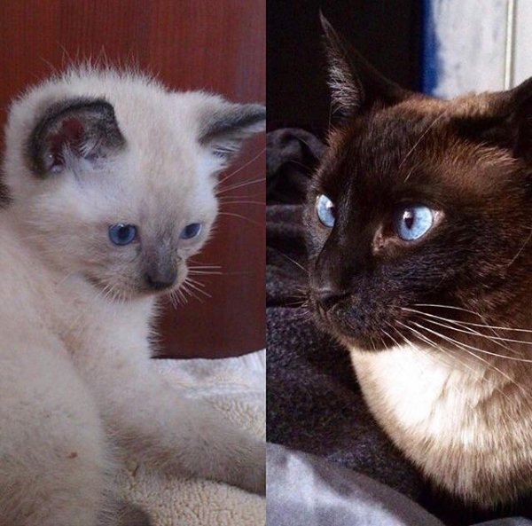 Як змінився колір моєї сіамської кішки Лоли? На першому фото їй 1 місяць, а на другому – 8 років.