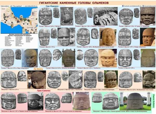 Величезні кам'яні скульптури у формі голів, знайдені біля колишньої «країни ольмеків» у Мексиці, досі викликають багато питань. Вчені що неспроможні визначити їх точний вік, достовірну причину їх будівництва, а дехто навіть вбачають у яких риси представників негроїдної раси. Втім, із цивілізацією ольмеків, писемність яких досі не розшифрована, пов'язано чимало й інших таємниць.