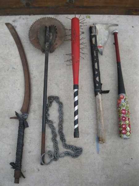 Деякі люди стурбовані часом, який настане після апокаліпсису. Зброю потрібно буде зробити із підручного матеріалу, а зразки таких засобів захисту та нападу представлені на фото. У хід піде садовий та спортивний інвентар, металеві труби та метри колючого дроту – чим страшніше, тим надійніше.