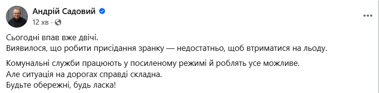 Також мер повідомив, що комунальні служби працюють у посиленому режимі. «Комунальні служби працюють у посиленому режимі й роблять усе можливе», – написав Садовий.