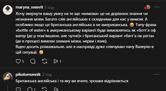 - «Хочу звернути вашу увагу на те що «вимова» це не дорівнює знання чи незнання мови. Багато слів англійських є складними для нас у вимові. А особливо якщо це британська англійська, а не американська».