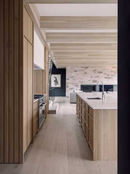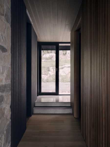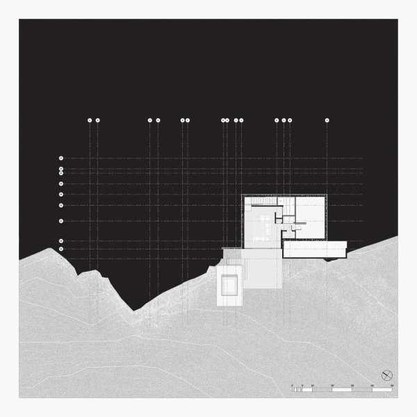 Проста форма об'ємів та їх композиція, що повторюється, посилюють горизонтальний вигляд ділянки з берега і навмисно поміщають архітектуру на задній план, поступаючись місцем мінеральній текстурі скельної шапки. Проривний вигляд майже на перший поверх з південного боку аналогічний бельведеру при прогулянці на вулицю. Проте проект пропонує суттєвий контрапункт за своєю композицією: він щедро виходить на високі скелі, а не просто на озеро. Відносно вертикальна композиція цього іншого «головного» фасаду резиденції забезпечує просторе вікно з боків внутрішніх сходів будівлі. Горизонтальне планування першого поверху, запропоноване його широким виходом на озеро, протиставляється вертикальним рухам на сходах, що дозволяє оцінка «природної стіни» скель з різних точок зору кожному з трьох поверхів.