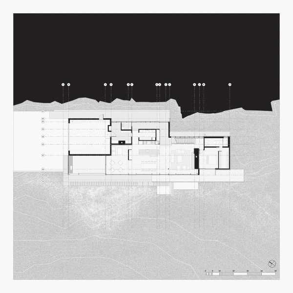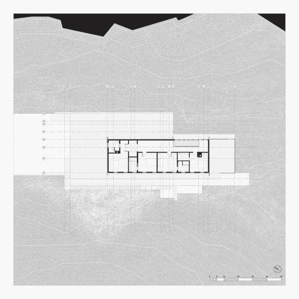 Дуже крутий рельєф та високі скелясті урвища залишали мало можливостей для реалізації. Як «нульовий рівень» було обрано дуже велику плоску кам'яну шапку на березі озера, що дозволило створити анкерну ідентичність архітектурного проекту. Пропонований як свого роду природний балкон над озером, ця шапка мала особливу перевагу близькості до високих скель, що межували з ділянкою землі навпроти великої водойми, і дозволяла повністю оцінити монументальність цієї природи. Загальна морфологія проекту відображала ландшафтну стратегію, що дозволяє реалізувати його саме в цьому місці, наслідуючи лінійні особливості цього кам'яного масиву.