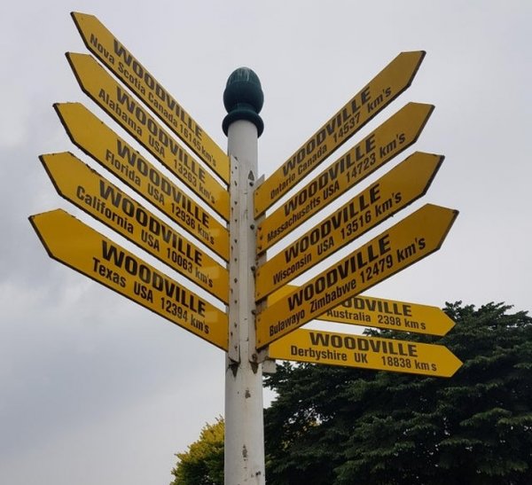 Знак у новозеландському місті Вудвілль, який показує відстань до всіх населених пунктів з такою самою назвою