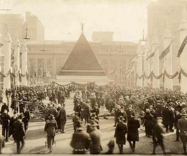 Піраміда, зведена із захоплених німецьких шоломів в часи Першої світової війни, Нью-Йорк, 1918 рік.