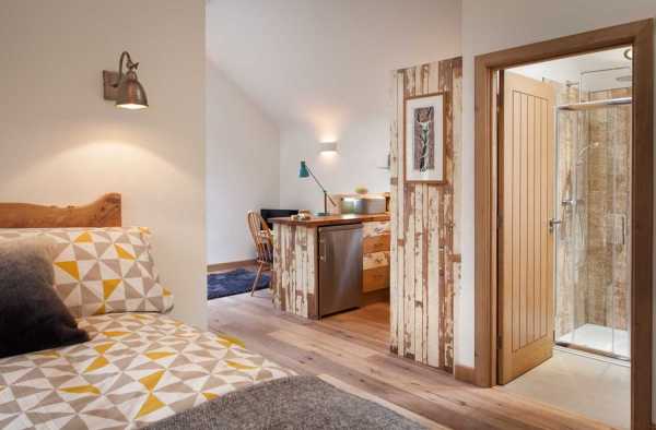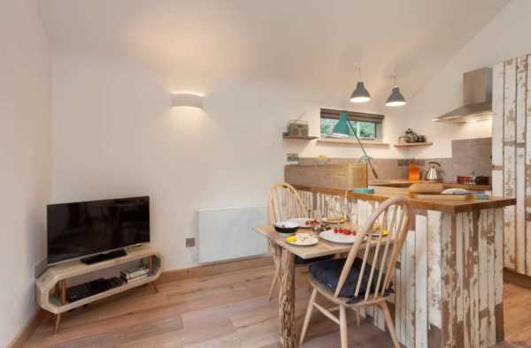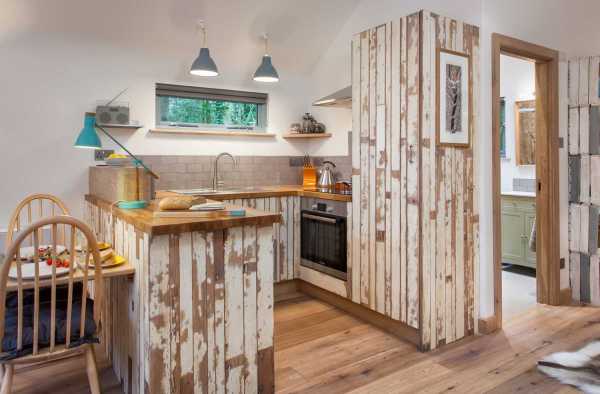 На противагу зовнішньому вигляду, інтер'єр будинку з відкритим «Г»-подібним плануванням досить сучасний. Кругла форма вікна вітальні знаходить своє відображення в плавно вигнутому переході від стін до стелі склепіння. Стеля спальні також трохи хвиляста. Для створення сільської атмосфери кухня зроблена їх 80-річних утилізованих дощок, тоді як складені дерев'яні ящики біля входу замінюють полиці.