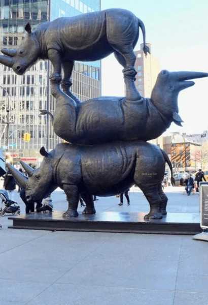Ця скульптура була на Астор-плейс. Вона була встановлена, щоб привернути увагу до трьох північних білих носорігів, що залишилися живими.