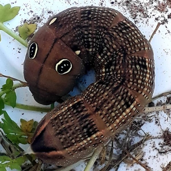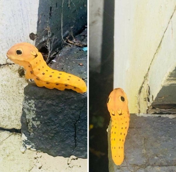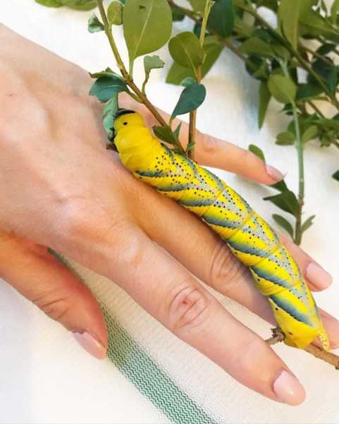 Це гусениця метелика “Мертва голова”. Незважаючи на похмуру назву, комаха виглядає як жовтий папужка