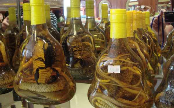 В даному випадку точно не можна сказати, що напій не містить заявлених інгредієнтів. Їх дійсно настоюють на поміщених на декілька місяців у пляшку з рисовим вином чи іншим алкогольним зерновим напоєм гадюках та скорпіонах, ферменти яких роблять свою справу, та напої набувають специфічних особливостей. Вважається, що таке вино покращує здоров'я, тому у традиційній китайській медицині застосовується як ліки. Такі напої можливо придбати також у В'єтнамі, південно-східній Азії та інтернеті.
