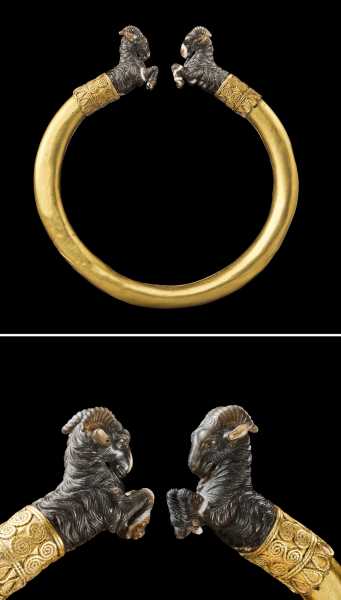 Грецький золотий браслет з клемами у вигляді козлів, що б'ються. V століття до нашої ери, зроблений із золота та агату.