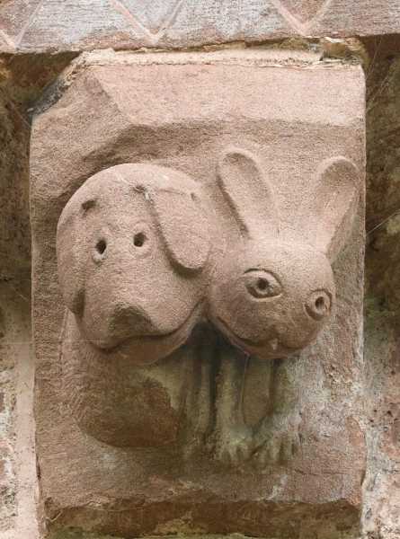 Консоль 12 століття в церкві Святої Марії та Святого Давида в Кілпеці, Англія, із зображенням собаки та зайця