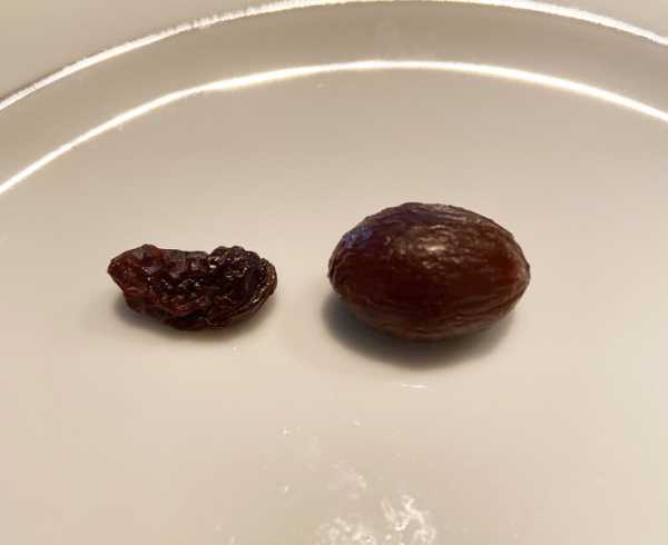 Ось що буде із родзинками (на фото праворуч), якщо замочити його у гарячій воді на всю ніч
