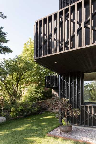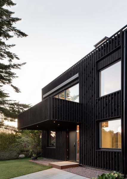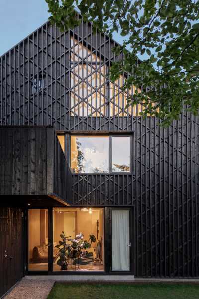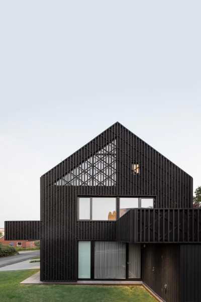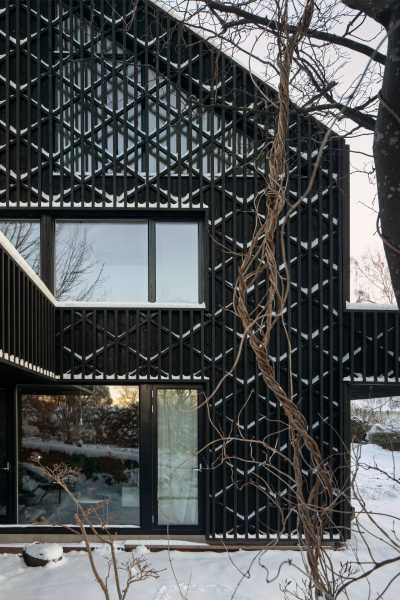 Модний сучасний вигляд і виразність будинку забезпечує незвичайний дизайн фасадів, облицювання якого являє собою три сітки діагональних і вертикальних ребер. Декоративний фасад виконує роль додаткового екрана, що оберігає будівлю від палючого сонця, зливи та снігу. Покрівля є поєднанням обробленої дерев’яної панелі та сонячних панелей, які забезпечують дві третини споживання електроенергії будинком та електромобілем.