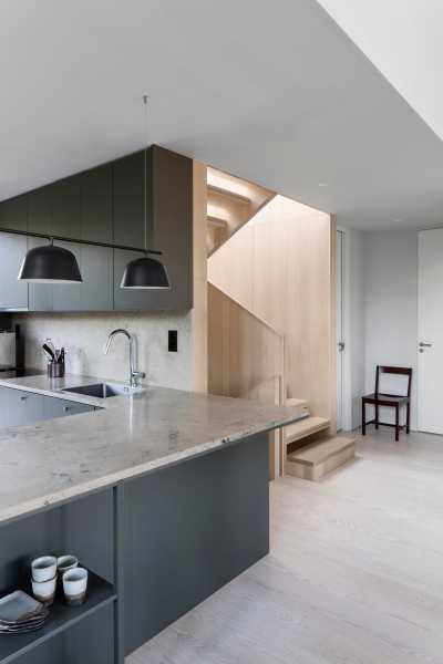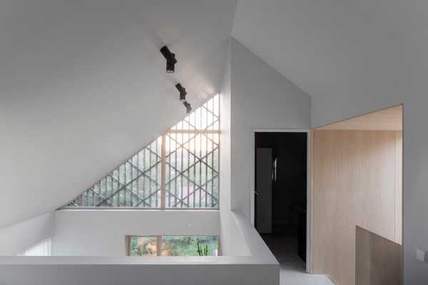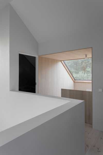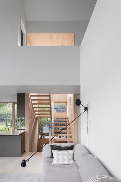 Інша перешкода виникла через розміщення будівлі на схилі, і полягала вона у створенні світлих приміщень із найкращими краєвидами на всіх рівнях, зокрема й на нижньому ярусі. Завдання було вирішено за допомогою проєктування просторів відкритого планування з великими вікнами, стелями подвійної висоти та відкритими дерев’яними сходами, розташованими в тильній частині будинку з великими вікнами та скляним верхом. Відкритість приміщень дала можливість не лише створити затишні та світлі інтер’єри, а й налагодити їхній тісний зв’язок із навколишньою природою. Старанно розроблена система штучного освітлення доповнює освітлення будинку у вечірній час і в негоду.