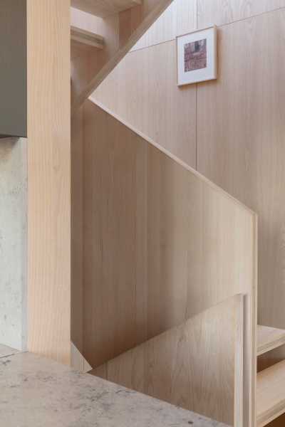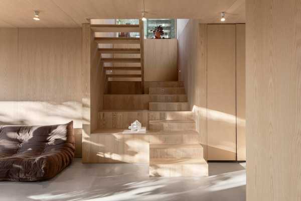 Для оздоблення інтер’єрів застосовується деревина природного кольору, що робить простір будинку особливо комфортним і теплим. Родзинкою інтер’єру є чудові сходи, виготовлені з ясена. Її широкі сходинки можуть використовуватися як місця для сидіння або виставкової площі.