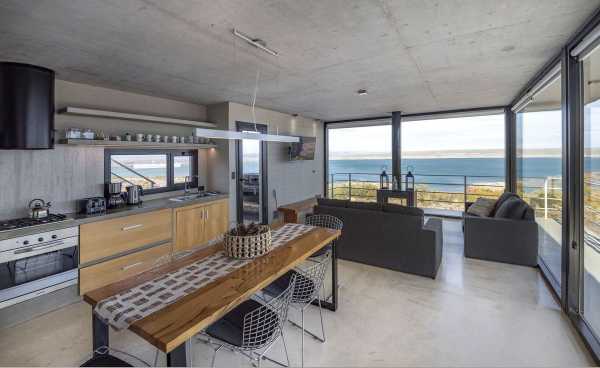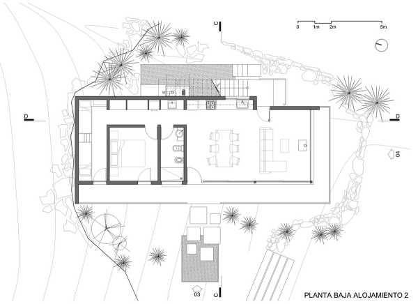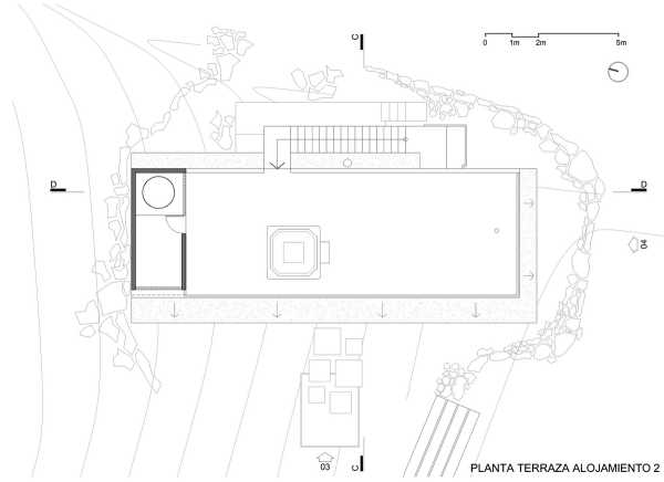 Використання бетону в якості основного будівельного та оздоблювального матеріалу, а також його якості як елемента, що не потребує особливого догляду і має велику довговічність, зробили його ідеальним для тієї функції, яка призначалася для конструкції. Колір, текстура та його кам'янисті властивості поєднують його з червоною кам'яною середовищем, в той же час контрастуючи і розрізняючи її. Це дві одиниці для розміщення туристів площею близько 95 м2 кожна, розташовані таким чином, щоб між ними не було візуальних перерв, і намагаються якнайкраще захопити та використовувати види на озеро. Дахи використовувалися як доступні тераси, де розташовані джакузі, звідки можна насолоджуватися краєвидом. Пішохідний доступ до них здійснюється по сходах у вигляді бетонних блоків, які височіють прямо над природним грунтом і ведуть до консольних терас, що оточують головні фасади, підкреслюючи ідею архітектури, що стоїть на землі, не торкаючись її.