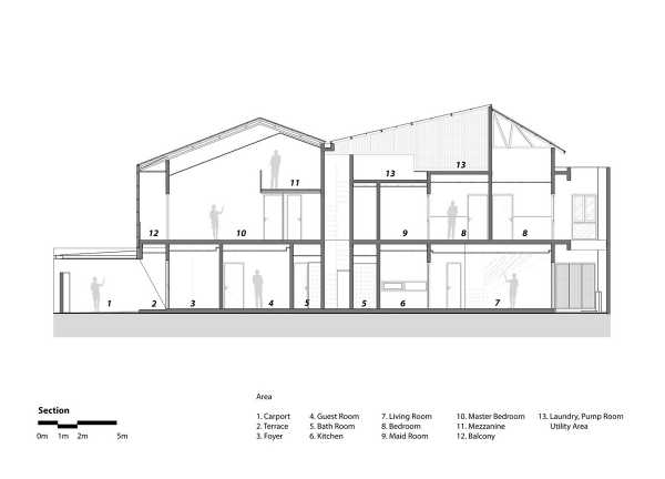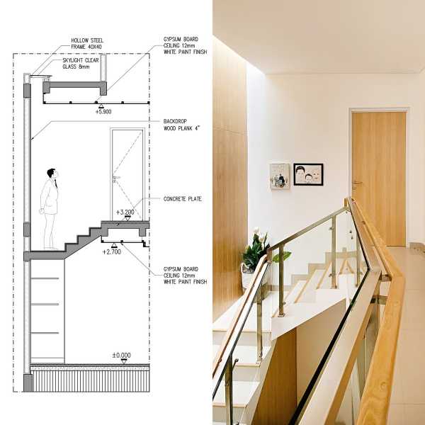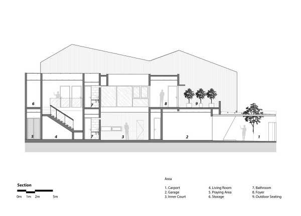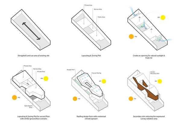 Основна концепція будинку визначається чітким просторовим розмежуванням особистої, загальної та службової зон, при цьому кожна ділянка є відкритою, вільною та безперервною, що особливо актуально в обставинах, коли сім’я проводить більшу частину часу вдома. Зовнішні перегородки допомагають гнучко розподіляти природне освітлення, об’єднуючи розрізнені функції в одне ціле.