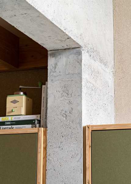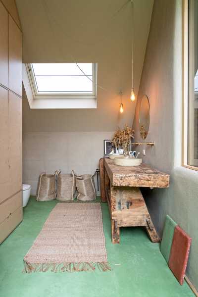 Особливістю проекту є його екологічність та ретельний відбір матеріалів. Як ізоляційний матеріал для стін було використано конопляне вапно, для даху — пластівці целюлози. Внутрішні стіни оздоблені мергелем, глинистим каменем, що забезпечує грубу природну текстуру, а ванні кімнати – водовідштовхувальною вапняною штукатуркою таделакт. Несучі видимі перекриття виконані з дерева, предмети кухонних меблів – з блокових дощок, а двері з опалубного матеріалу.