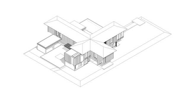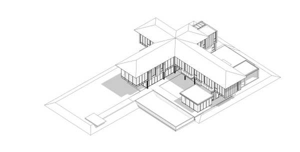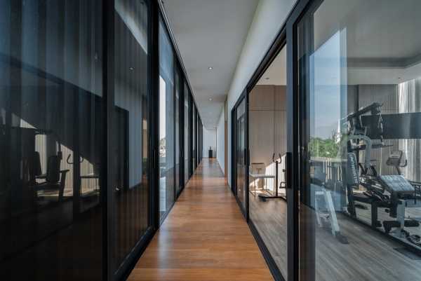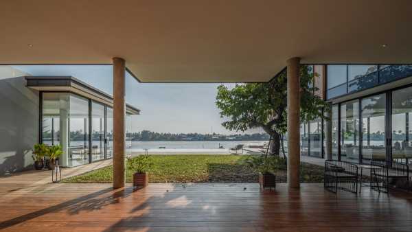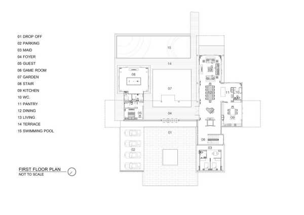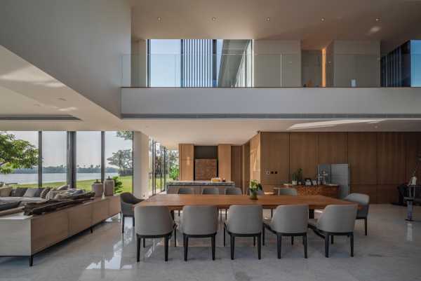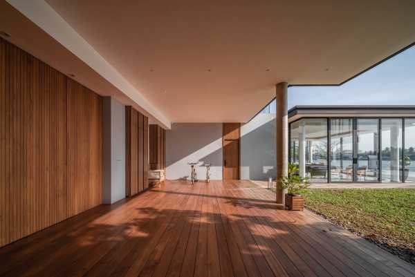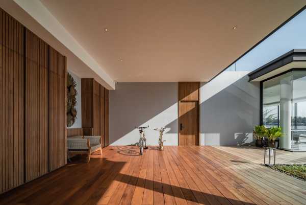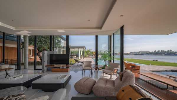 Житловий простір розділений по обидва боки коридору, який сприймається як місцевість за межами будівлі. Зліва від нього розміщені гостьова кімната, ігрова кімната та просторий басейн, що генерує відчуття єдності річки та будинку. Права частина будинку є персональною зоною родини. Тут розташована велика вітальня з висотою стелі понад три метри, яка поєднана в єдиний простір з кухнею та обідньою зоною.