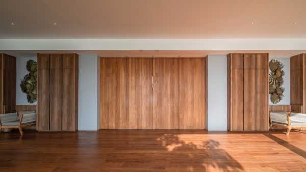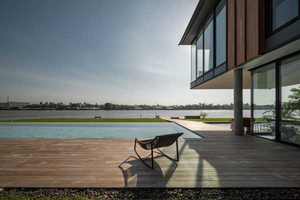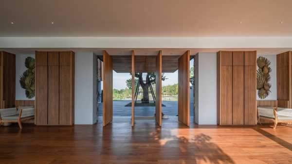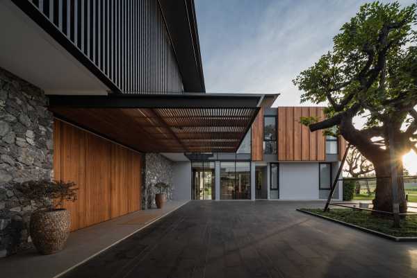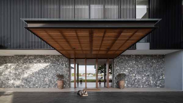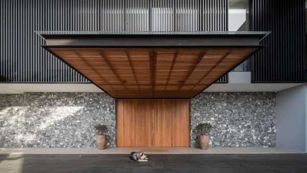 Центральний вхід до будинку ефектно підкреслено масивною кам’яною стіною, за якою знаходиться соціальна зона відкритого планування. Кам’яна стіна не тільки забезпечує потрібний рівень приватності, але й слугує “стіною несподіванок”, потрапляючи за яку, гість опиняється у світі розкішного інтер’єру та захопливих панорам на річку Мае Клонг.