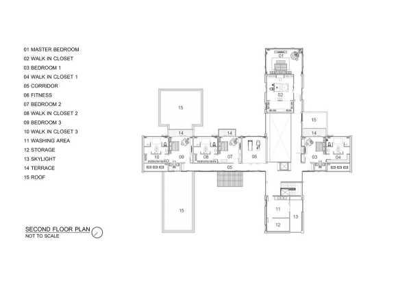 Ліфт і сходи ведуть на другий поверх, де знаходяться 4 спальні з індивідуальними ванними кімнатами та гардеробними, а також спортивний зал. Головна спальня виступає консоллю на п’ять метрів над житловою зоною, виконуючи функцію захисного навісу від сонячних променів і опадів. Великі площі скління будівлі дозволяють безперешкодно спостерігати за краєвидами, зокрема бачити місце злиття двох річок.