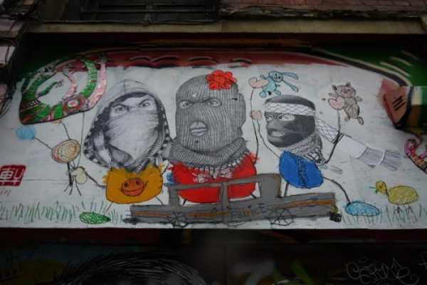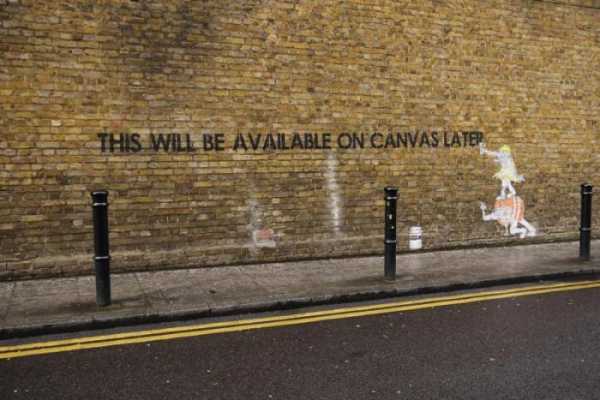 Дуже схоже на Бенксі, але скоріше це його наслідувачі. Напис говорить: “На полотні буде доступно пізніше”. Бенксі, до речі, найбільш розшукувана у світі мистецтва людина, так званий арт-терорист. Цей андеграундний англійський художник відомий завдяки його графіті, що має гостросоціальний характер. Його роботи висловлюють протест капіталізму, реклами, телебачення, війни та інших тем, які так хвилюють молодь.