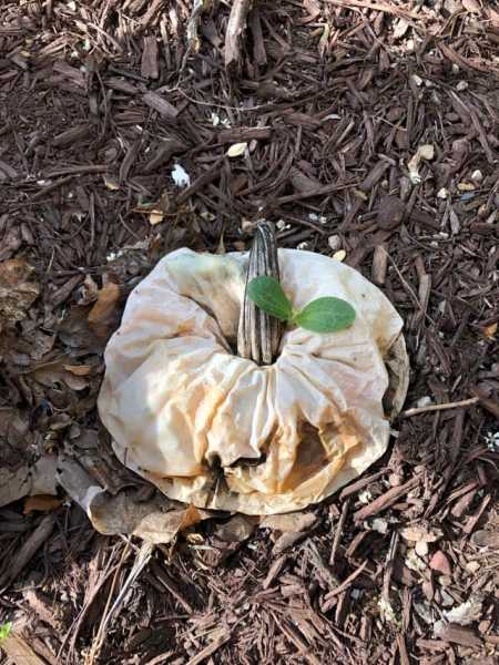 Ми залишили наші гарбузи з Геловіну на всю зиму на вулиці, і з одного з них росте нова рослина