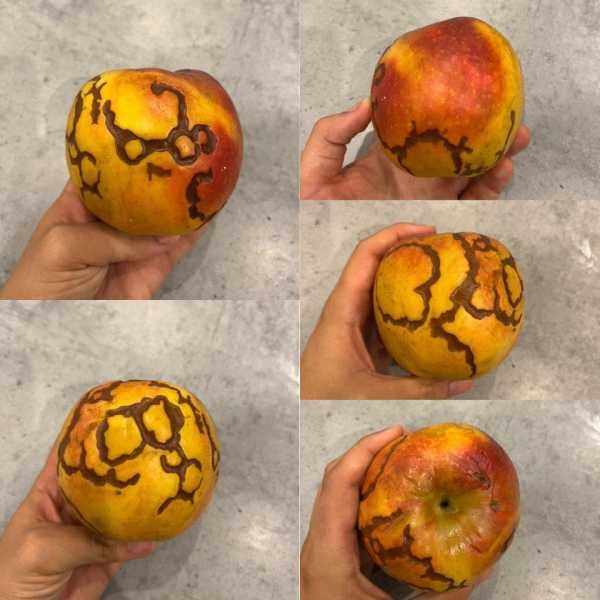 Апельсин, на якому я багато років тому тренувався у нанесенні своїх перших татуювань. Я поклав його на поличку і не згадував про нього. Тепер він засох, але при цьому зберіг на собі всі зображення. Він майже нічого не важить і твердий, наче камінь.