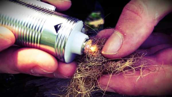Отримати вогонь можна за допомогою ліхтарика, проте його доведеться зламати. Суть у тому, щоб вийняти та оголити дугу лампочки. Після цього підносимо її до сухого трута і натискаємо на кнопку «увімкнути». Електричний розряд виконає всю роботу.
