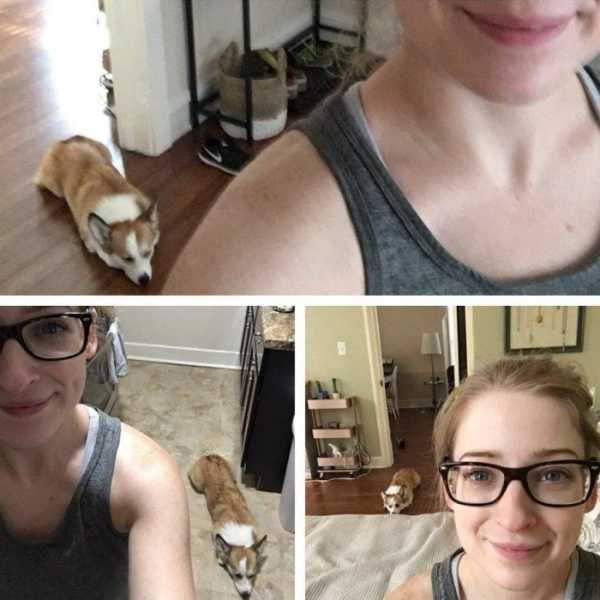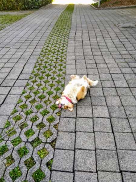 Собака, що слідує за власницею по будинку, але при кожній сприятливій нагоді падає на животик.