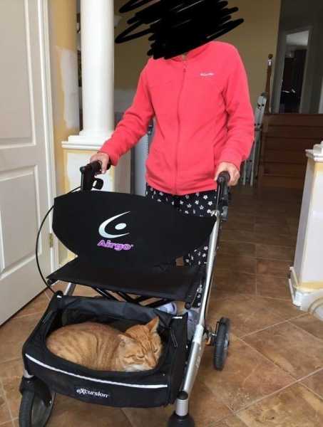 Мою бабусю тільки-но виписали з лікарні, і вона використовує ходунки. Мій кіт поводиться як її недбалий охоронець.